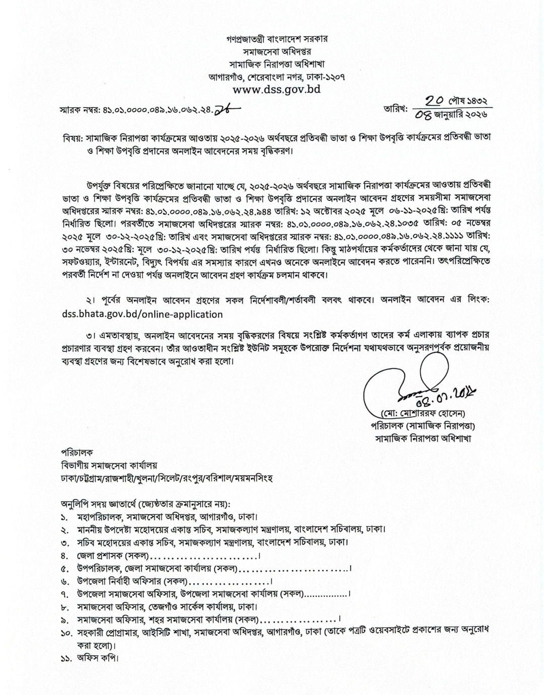 সমাজসেবা অধিদপ্তরের আওতাধীন সামাজিক নিরাপত্তা কর্মসূচির অধীনে ২০২৫–২০২৬ অর্থবছরের জন্য প্রতিবন্ধী ভাতা ও প্রতিবন্ধী শিক্ষার্থীদের শিক্ষা উপবৃত্তির অনলাইন আবেদনের সময়সীমা বৃদ্ধি করা হয়েছে।
